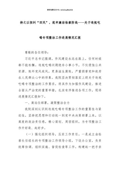【七哥公文】2025年:【七哥公文】持之以恒纠“四风”,筑牢廉洁检察防线——关于违规吃喝专项整治工作进展情况汇报+更多免费公文+VX:QiGeGongWen2024+更多免费公文+VX:QiGeGongWen2024