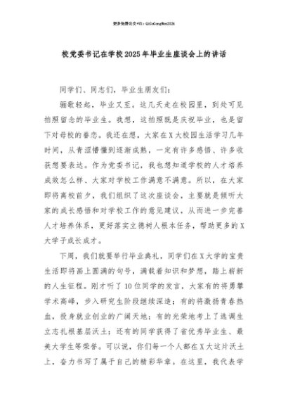 【七哥公文】2025年:【七哥公文】校党委书记在学校2025年毕业生座谈会上的讲话+更多免费公文+VX:QiGeGongWen2024+更多免费公文+VX:QiGeGongWen2024
