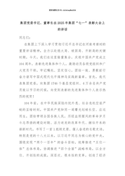 【七哥公文】2025年:【七哥公文】集团党委书记、董事长在2025年集团“七一”表彰大会上的讲话+更多免费公文+VX:QiGeGongWen2024+更多免费公文+VX:QiGeGongWen2024