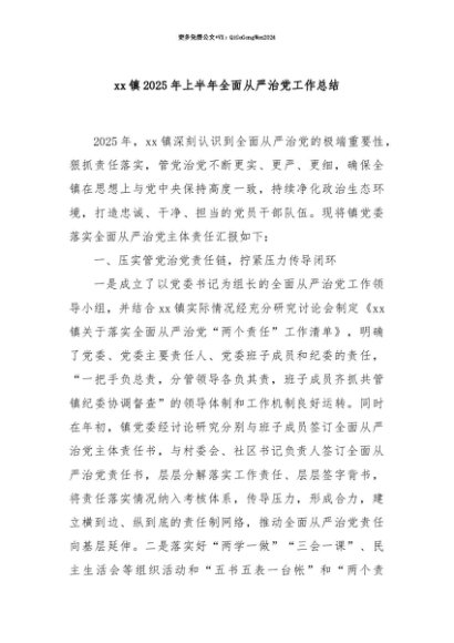 【七哥公文】2025年:【七哥公文】xx镇2025年上半年全面从严治党工作总结+更多免费公文+VX:QiGeGongWen2024+更多免费公文+VX:QiGeGongWen2024