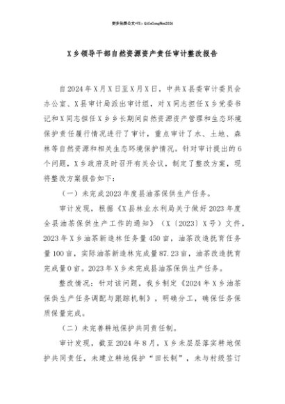 【七哥公文】2025年:【七哥公文】X乡领导干部自然资源资产责任审计整改报告+更多免费公文+VX:QiGeGongWen2024+更多免费公文+VX:QiGeGongWen2024