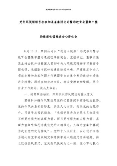 【七哥公文】2025年:【七哥公文】党组巡视组组长在参加某某集团公司警示教育会暨集中整治违规吃喝推进会心得体会+更多免费公文+VX:QiGeGongWen2024+更多免费公文+VX:QiGeGongWen2024