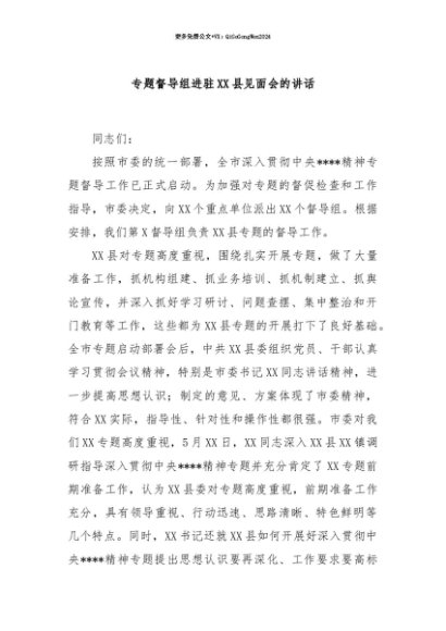 【七哥公文】2025年:【七哥公文】专题督导组进驻XX县见面会的讲话+更多免费公文+VX:QiGeGongWen2024+更多免费公文+VX:QiGeGongWen2024