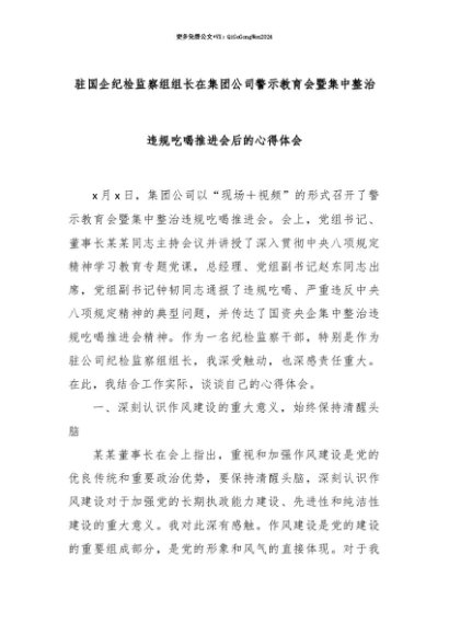 【七哥公文】2025年:【七哥公文】驻国企纪检监察组组长在集团公司警示教育会暨集中整治违规吃喝推进会后的心得体会+更多免费公文+VX:QiGeGongWen2024+更多免费公文+VX:QiGeGongWen2024