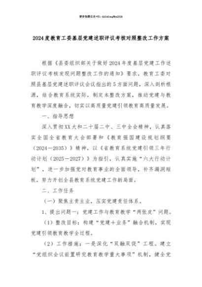【七哥公文】2025年:【七哥公文】2024度教育工委基层党建述职评议考核对照整改工作方案+更多免费公文+VX:QiGeGongWen2024+更多免费公文+VX:QiGeGongWen2024