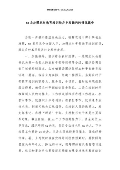 【七哥公文】2025年:【七哥公文】xx县加强农村教育培训助力乡村振兴的情况报告+更多免费公文+VX:QiGeGongWen2024+更多免费公文+VX:QiGeGongWen2024