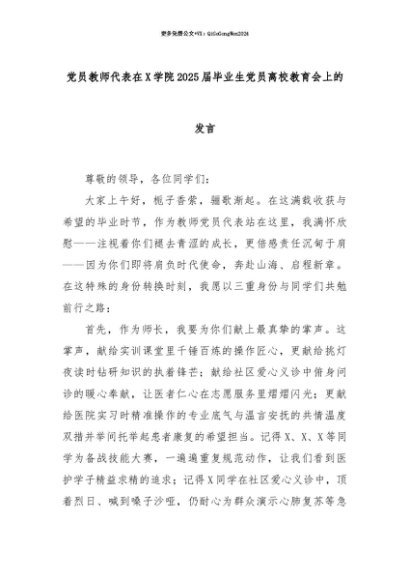 【七哥公文】2025年:【七哥公文】党员教师代表在X学院2025届毕业生党员离校教育会上的发言+更多免费公文+VX:QiGeGongWen2024+更多免费公文+VX:QiGeGongWen2024