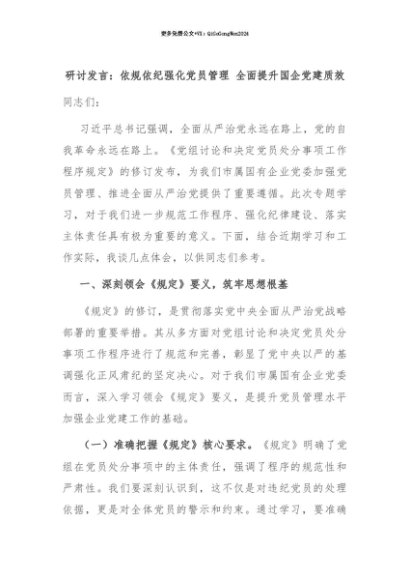【七哥公文】2025年:【七哥公文】研讨发言:依规依纪强化党员管理 全面提升国企党建质效+更多免费公文+VX:QiGeGongWen2024+更多免费公文+VX:QiGeGongWen2024