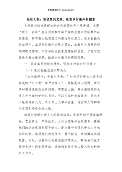 【七哥公文】2025年:【七哥公文】经验汇报:固堡垒促发展,绘就乡村振兴新图景+更多免费公文+VX:QiGeGongWen2024+更多免费公文+VX:QiGeGongWen2024