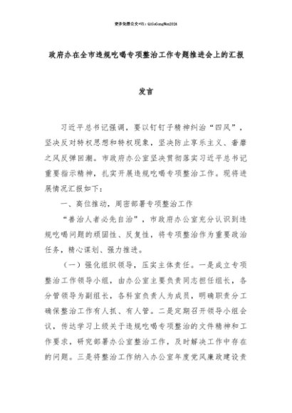 【七哥公文】2025年:【七哥公文】政府办在全市违规吃喝专项整治工作专题推进会上的汇报发言+更多免费公文+VX:QiGeGongWen2024+更多免费公文+VX:QiGeGongWen2024