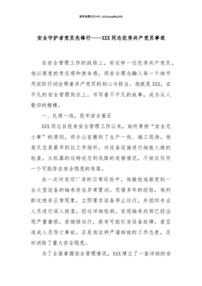 【七哥公文】2025年:【七哥公文】安全守护者党员先锋行——XXX同志优秀共产党员事迹+更多免费公文+VX:QiGeGongWen2024+更多免费公文+VX:QiGeGongWen2024