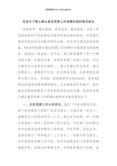 【七哥公文】2025年:【七哥公文】某县关于建立健全基层党建工作保障机制的情况报告+更多免费公文+VX:QiGeGongWen2024+更多免费公文+VX:QiGeGongWen2024