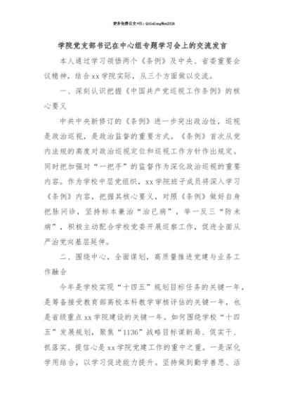 【七哥公文】2025年:【七哥公文】学院党支部书记在中心组专题学习会上的交流发言+更多免费公文+VX:QiGeGongWen2024+更多免费公文+VX:QiGeGongWen2024
