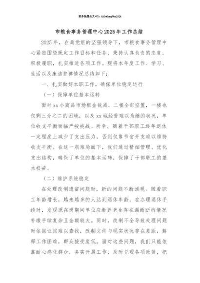 【七哥公文】2025年:【七哥公文】市粮食事务管理中心2025年工作总结+更多免费公文+VX:QiGeGongWen2024+更多免费公文+VX:QiGeGongWen2024
