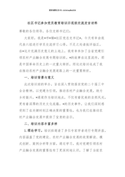 【七哥公文】2025年:【七哥公文】社区书记参加党员教育培训示范班交流发言材料+更多免费公文+VX:QiGeGongWen2024+更多免费公文+VX:QiGeGongWen2024