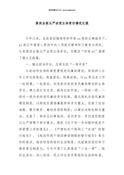 【七哥公文】2025年:【七哥公文】落实全面从严治党主体责任情况汇报+更多免费公文+VX:QiGeGongWen2024+更多免费公文+VX:QiGeGongWen2024