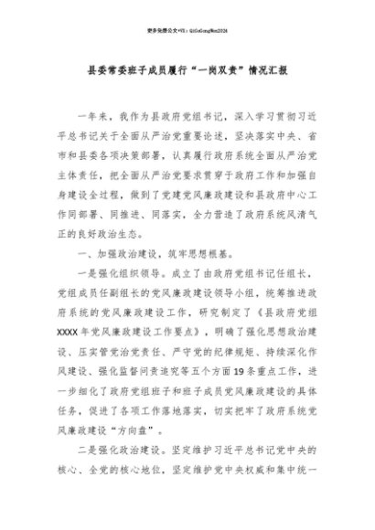 【七哥公文】2025年:【七哥公文】县委常委班子成员履行“一岗双责”情况汇报+更多免费公文+VX:QiGeGongWen2024+更多免费公文+VX:QiGeGongWen2024