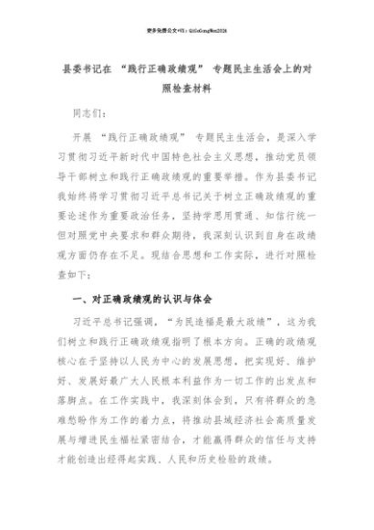 【七哥公文】2025年:【七哥公文】县委书记在 “践行正确政绩观” 专题民主生活会上的对照检查材料+更多免费公文+VX:QiGeGongWen2024+更多免费公文+VX:QiGeGongWen2024
