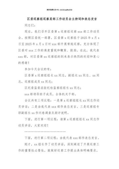 【七哥公文】2025年:【七哥公文】区委巡察组巡察某部工作动员会主持词和表态发言+更多免费公文+VX:QiGeGongWen2024+更多免费公文+VX:QiGeGongWen2024