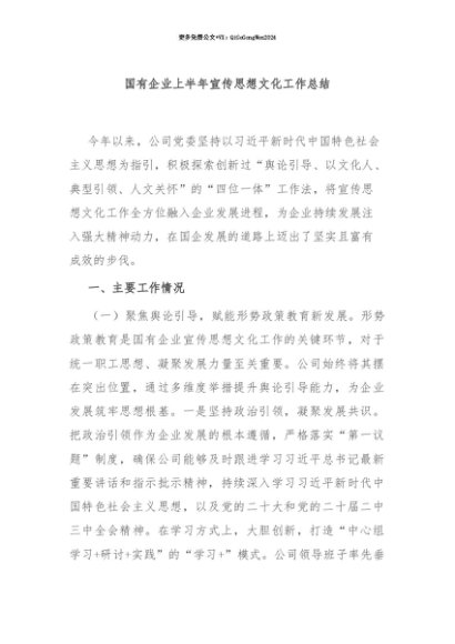 【七哥公文】2025年:【七哥公文】国有企业上半年宣传思想文化工作总结+更多免费公文+VX:QiGeGongWen2024+更多免费公文+VX:QiGeGongWen2024