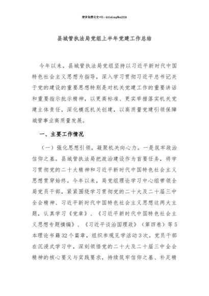 【七哥公文】2025年:【七哥公文】县城管执法局党组上半年党建工作总结+更多免费公文+VX:QiGeGongWen2024+更多免费公文+VX:QiGeGongWen2024