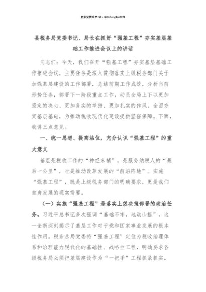 【七哥公文】2025年:【七哥公文】县税务局党委书记、局长在抓好“强基工程”夯实基层基础工作推进会议上的讲话+更多免费公文+VX:QiGeGongWen2024+更多免费公文+VX:QiGeGongWen2024