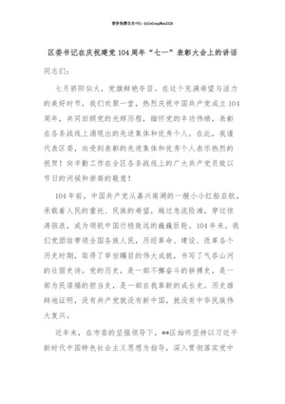 【七哥公文】2025年:【七哥公文】区委书记在庆祝建党104周年“七一”表彰大会上的讲话+更多免费公文+VX:QiGeGongWen2024+更多免费公文+VX:QiGeGongWen2024