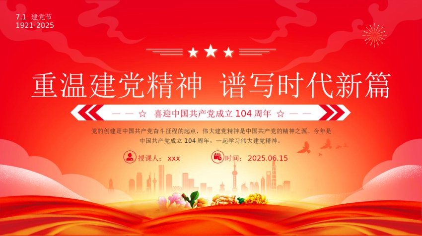 【七哥公文】2025年:【七哥公文】七一党课PPT:2025建党104周年PPT红色大气重温建党精神谱写时代新篇+更多免费公文+VX:QiGeGongWen2024+更多免费公文+VX:QiGeGongWen2024