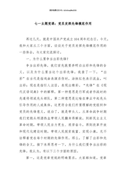 【七哥公文】2025年:【七哥公文】七一主题党课:党员发挥先锋模范作用+更多免费公文+VX:QiGeGongWen2024+更多免费公文+VX:QiGeGongWen2024