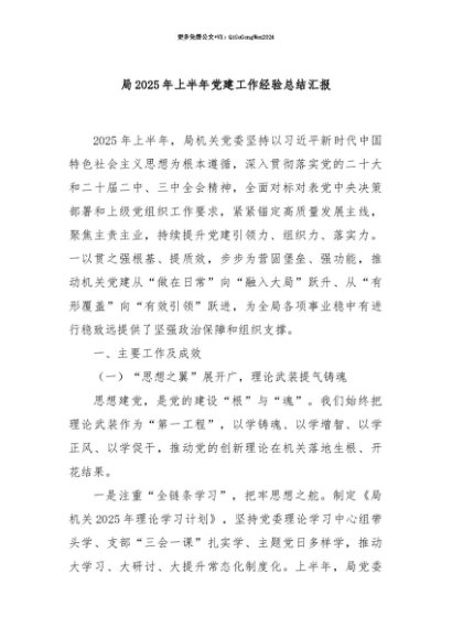 【七哥公文】2025年:【七哥公文】局2025年上半年党建工作经验总结汇报+更多免费公文+VX:QiGeGongWen2024+更多免费公文+VX:QiGeGongWen2024