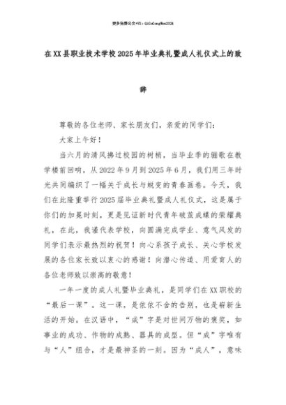 【七哥公文】2025年:【七哥公文】在XX县职业技术学校2025年毕业典礼暨成人礼仪式上的致辞+更多免费公文+VX:QiGeGongWen2024+更多免费公文+VX:QiGeGongWen2024