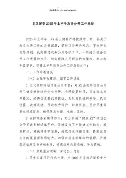 【七哥公文】2025年:【七哥公文】县卫健委2025年上半年政务公开工作总结+更多免费公文+VX:QiGeGongWen2024+更多免费公文+VX:QiGeGongWen2024