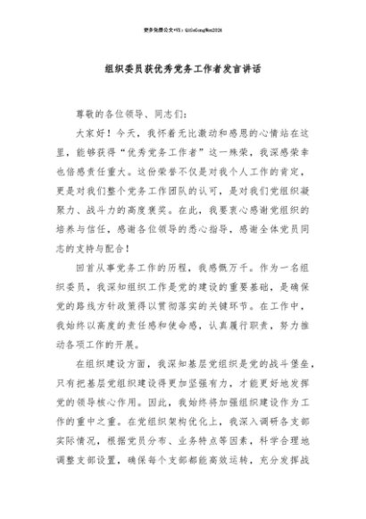 【七哥公文】2025年:【七哥公文】组织委员获优秀党务工作者发言讲话+更多免费公文+VX:QiGeGongWen2024+更多免费公文+VX:QiGeGongWen2024