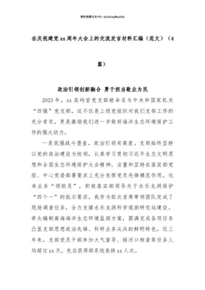 【七哥公文】2025年:【七哥公文】(4篇)在庆祝建党xx周年大会上的交流发言材料汇编(范文)+更多免费公文+VX:QiGeGongWen2024+更多免费公文+VX:QiGeGongWen2024