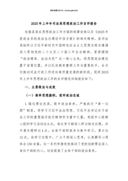 【七哥公文】2025年:【七哥公文】2025年上半年司法局思想政治工作自评报告+更多免费公文+VX:QiGeGongWen2024+更多免费公文+VX:QiGeGongWen2024