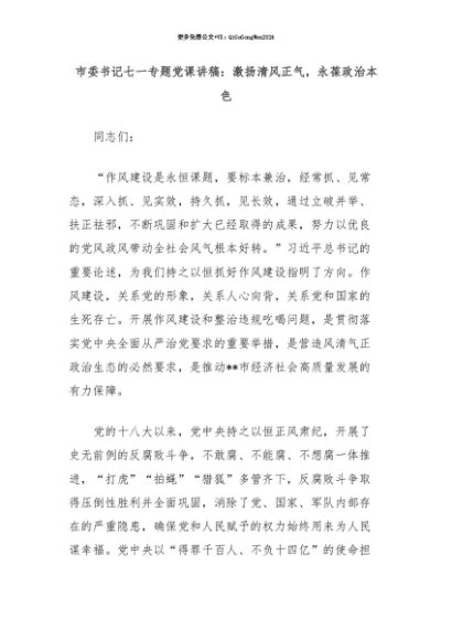 【七哥公文】2025年:【七哥公文】市委书记七一专题党课讲稿:激扬清风正气,永葆政治本色+更多免费公文+VX:QiGeGongWen2024+更多免费公文+VX:QiGeGongWen2024