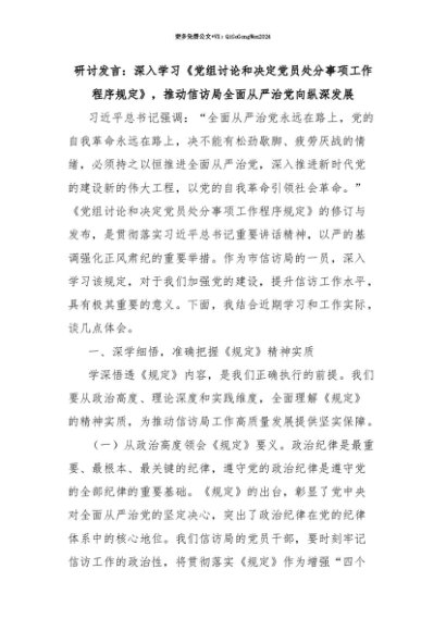 【七哥公文】2025年:【七哥公文】研讨发言:深入学习《党组讨论和决定党员处分事项工作程序规定》,推动信访局全面从严治党向纵深发展+更多免费公文+VX:QiGeGongWen2024+更多免费公文+VX:QiGeGongWen2024