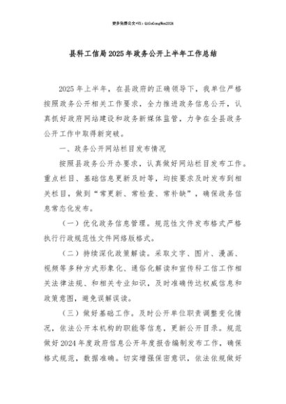 【七哥公文】2025年:【七哥公文】县科工信局2025年政务公开上半年工作总结+更多免费公文+VX:QiGeGongWen2024+更多免费公文+VX:QiGeGongWen2024