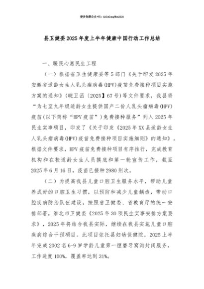 【七哥公文】2025年:【七哥公文】县卫健委2025年度上半年健康中国行动工作总结+更多免费公文+VX:QiGeGongWen2024+更多免费公文+VX:QiGeGongWen2024