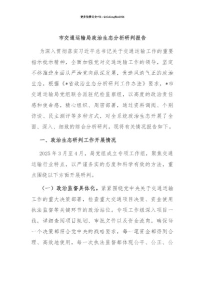 【七哥公文】2025年:【七哥公文】市交通运输局政治生态分析研判报告+更多免费公文+VX:QiGeGongWen2024+更多免费公文+VX:QiGeGongWen2024