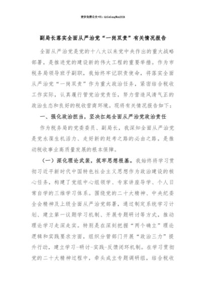 【七哥公文】2025年:【七哥公文】副局长落实全面从严治党“一岗双责”有关情况报告+更多免费公文+VX:QiGeGongWen2024+更多免费公文+VX:QiGeGongWen2024