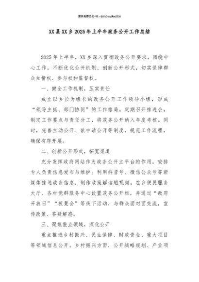 【七哥公文】2025年:【七哥公文】XX县XX乡2025年上半年政务公开工作总结+更多免费公文+VX:QiGeGongWen2024+更多免费公文+VX:QiGeGongWen2024