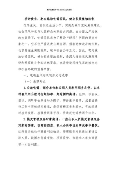 【七哥公文】2025年:【七哥公文】研讨发言:靶向施治吃喝歪风,健全长效整治机制+更多免费公文+VX:QiGeGongWen2024+更多免费公文+VX:QiGeGongWen2024