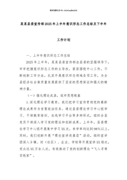 【七哥公文】2025年:【七哥公文】某某县委宣传部2025年上半年意识形态工作总结及下半年工作计划+更多免费公文+VX:QiGeGongWen2024+更多免费公文+VX:QiGeGongWen2024