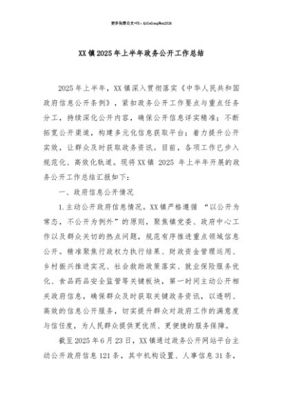 【七哥公文】2025年:【七哥公文】XX镇2025年上半年政务公开工作总结+更多免费公文+VX:QiGeGongWen2024+更多免费公文+VX:QiGeGongWen2024