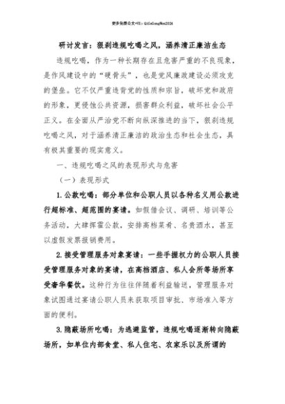 【七哥公文】2025年:【七哥公文】研讨发言:狠刹违规吃喝之风,涵养清正廉洁生态+更多免费公文+VX:QiGeGongWen2024+更多免费公文+VX:QiGeGongWen2024