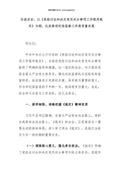 【七哥公文】2025年:【七哥公文】交流发言:以《党组讨论和决定党员处分事项工作程序规定》为纲,扎实推进纪检监察工作高质量发展+更多免费公文+VX:QiGeGongWen2024+更多免费公文+VX:QiGeGongWen2024
