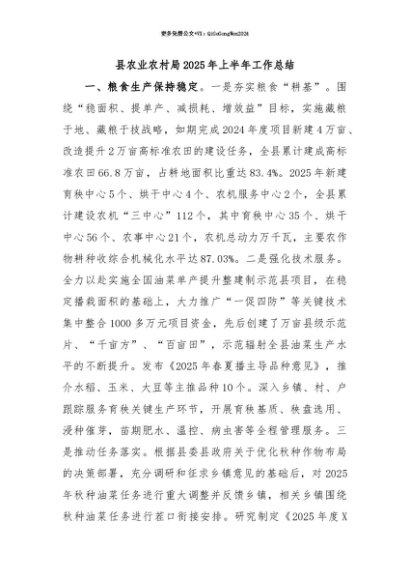 【七哥公文】2025年:【七哥公文】县农业农村局2025年上半年工作总结+更多免费公文+VX:QiGeGongWen2024+更多免费公文+VX:QiGeGongWen2024