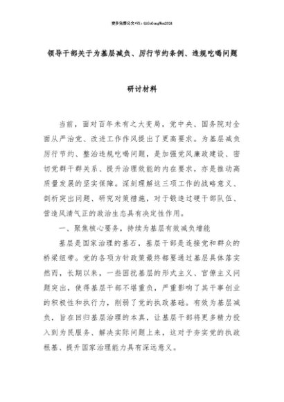 【七哥公文】2025年:【七哥公文】领导干部关于为基层减负、厉行节约条例、违规吃喝问题研讨材料+更多免费公文+VX:QiGeGongWen2024+更多免费公文+VX:QiGeGongWen2024