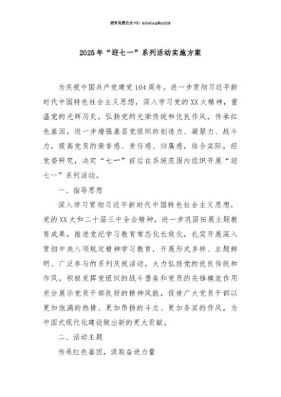 【七哥公文】2025年:【七哥公文】2025年“迎七一”系列活动实施方案+更多免费公文+VX:QiGeGongWen2024+更多免费公文+VX:QiGeGongWen2024